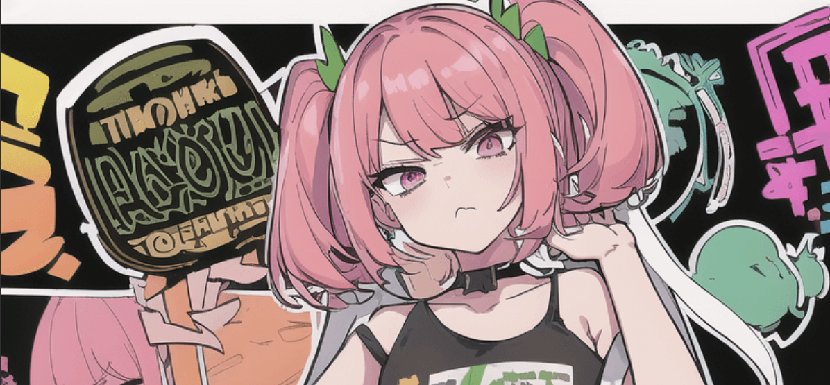 outline, ((Make the background of an image transparent)), BREAK best quality, (1girl), from bottom, pink and green hair, pink eyes in star, black skirt, white tanktop,midriff, looking at viewer, upset,(game play)Negative Prompt :